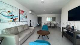 Se alquila apartamento amoblado en Costa del Este. Amplio y luminoso apartamento con 135 Mts2 distribuidos en salon, comedor, cocina integrada, 3 amplias habitaciones, 3 baños, balcon, adicional tiene cuarto y baño de servicio y area de lavanderia y 2 estacionamientos. El PH ofrece area social con piscina, GYM, canchas deportivas y full areas de recreacion para la familia,