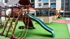 Área social con parque infantil y salón de fiesta.
