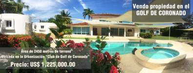 La propiedad tiene un área de * metros de terreno y está ubicada en la Urbanización “Club de Golf de Coronado”. La propiedad está dentro del Club, rodeada de la Cancha de Golf y a 1 Kilómetro de la playa. Tiene planta baja, planta alta. Hermosos jardines. Aprox. 1,000 metros de construccion y mejoras. Planta Baja: Área Abierta, Portal Techado, Rancho, Estacionamiento, Vestíbulo, sala, Comedor, amplia Cocina abierta con isla central, estufa profesional, nevera y freezer nuevas Recámara de Servicio con Baño, baño de visita. Amplio DEN con bar y mesa de pool, 2 Recámaras cada una con su baño. Amplia terraza con área techada de 50 mts y sundeck ********** Alta: Una Amplia suite con pisos de madera, bellamente decorada, Amplio y lujoso Baño revestido con pisos y paredes de mármol rustico, con closets de madera, Área de jacuzzi con cascada y sistema de sonido y **********: Casa de Cuidador con Recámara y baño, área de lavandería, cocineta, área de sala y comedor Bohío(2)