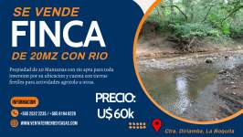 Vendo una finca de 20 mz Diríamba Carazo con un valor de 60 k dólares, excelente documento. Sin ningun problema de reforma agraria, cerca está los servicios básicos para desarrollar la finca, la finca no tiene casa es solo terreno la topografía del terreno es ondulada y tiene su áreas plana el río pasa en la propiedad en un costado.